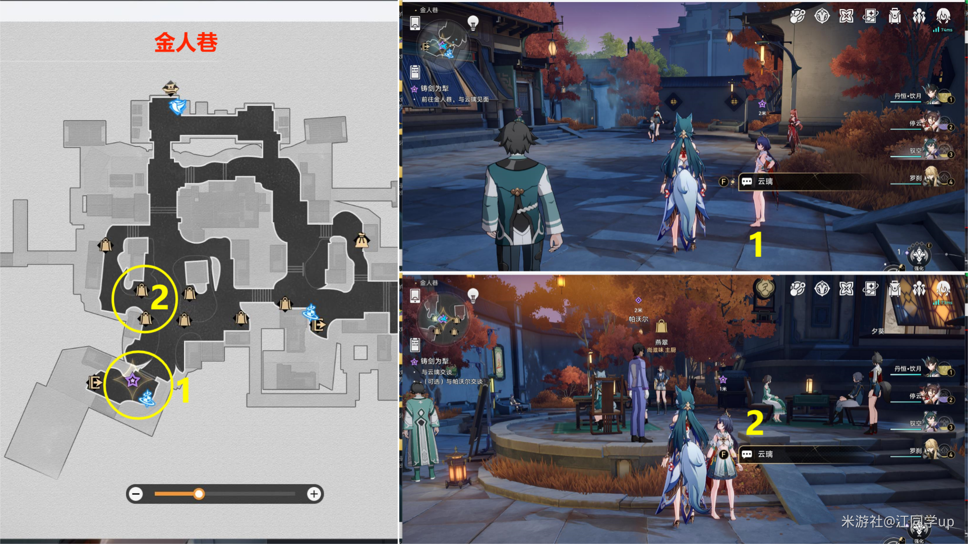 2. 第二站:金人巷,偶遇云璃,开启话痨模式! 跑到金人巷的1号和2号地点,找到云璃,和她进行亲切友好的交流(其实就是听她balabala讲剧情)。