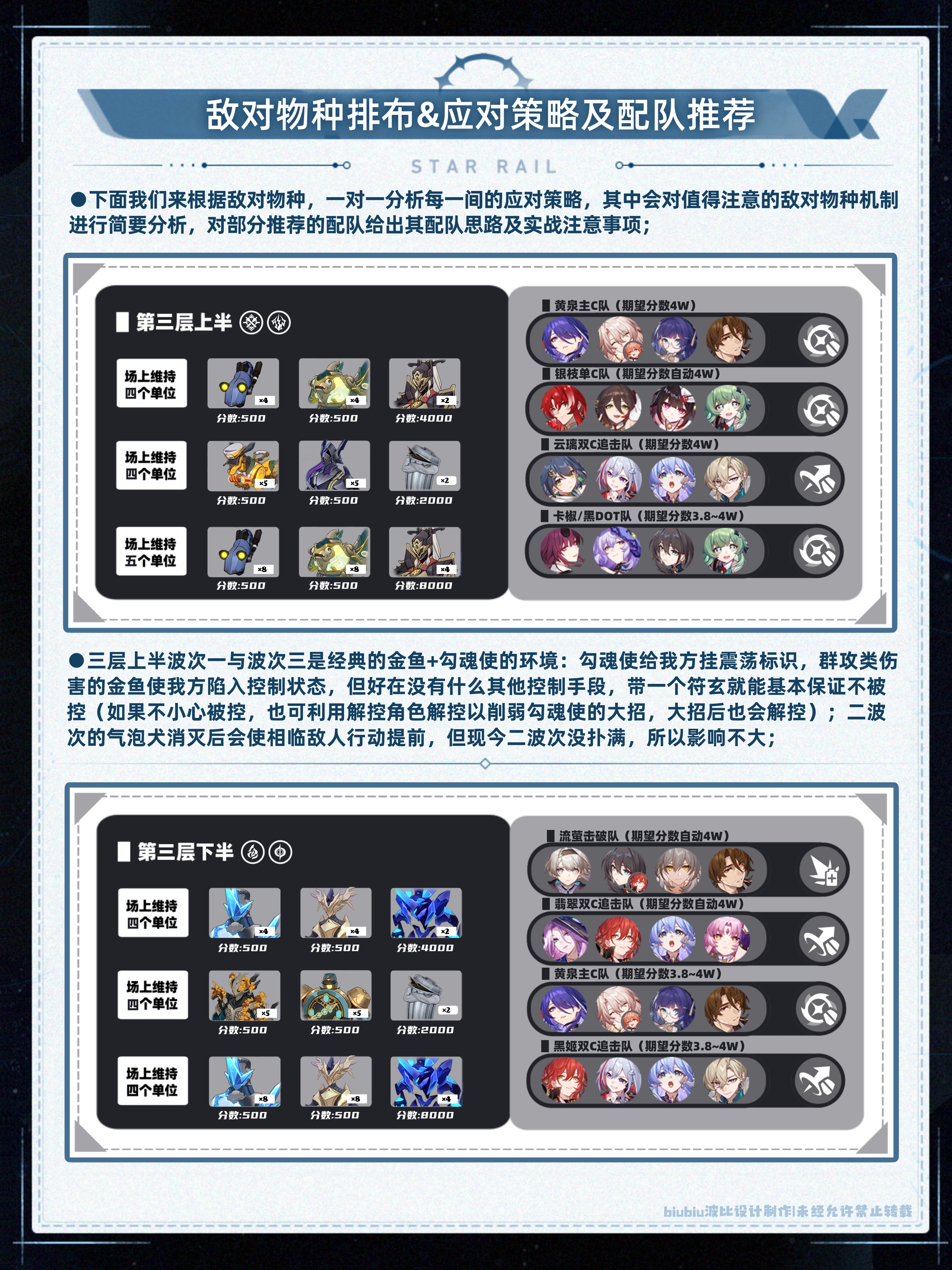 所以帖子中给出的配队基本都是实测后能保证拿满奖励的,这其中不妨会有替换某个角色,体验上会有天差地别的情况发生;(如追击队的砂金:对飞霄大招叠层、知更鸟大招充能、真理医生追击的触发均有一定帮助,因此换下可能会受影响);至于练度上则均按中低配(20+有效词条);