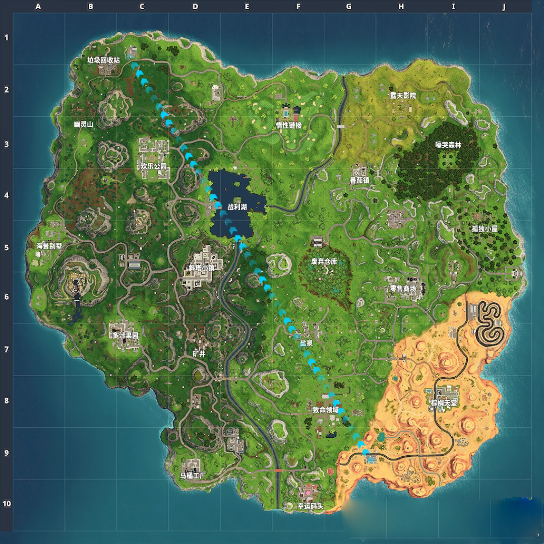 首先看一下地图都有哪些改变,在地图的右下角从以前的沼泽变成了一大片的沙漠。然后就是以前的混沌大地(俗称农场)修改为了惰性链接,从以前的农场变成了现在的豪宅。在一个就是在火箭发射的隔壁山顶从一个小房子改变成了看起来像部落村庄的一个地方,并且还有一艘大船,看起来就像海盗船一样的,并且还有一个大瀑布。最后就是地图的中心点:仓库。从以前的三个大仓库,后来的第四赛季到来陨石给砸出了一个大坑,在第四赛季结尾的时候慢慢长出了几棵大树,再到第五赛季遍地都是树木。