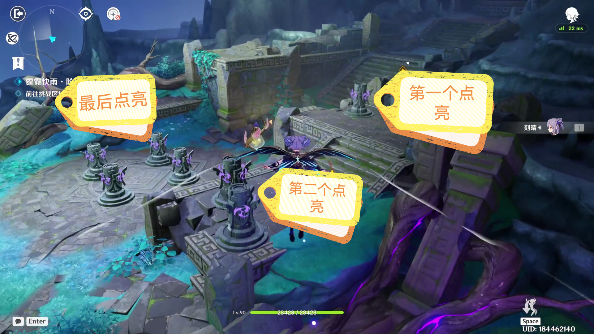 这一关的核心就是利用刻晴的E技能和武器附魔,以迅雷不及掩耳盗铃之势点亮7座元素碑!