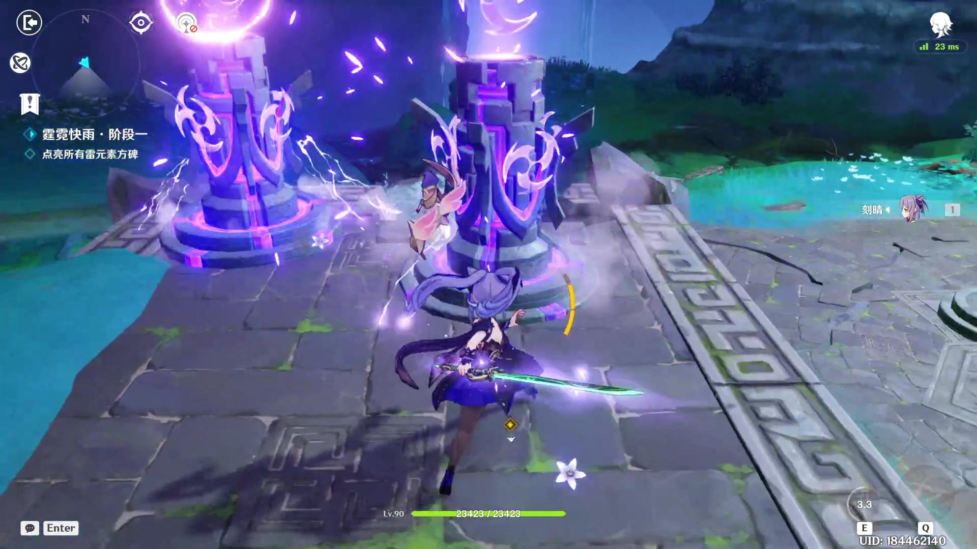 (1)跑到第一座元素碑附近,对着两座碑扔雷楔,然后潇洒位移!刻晴在位移的瞬间,第一座碑就亮了!