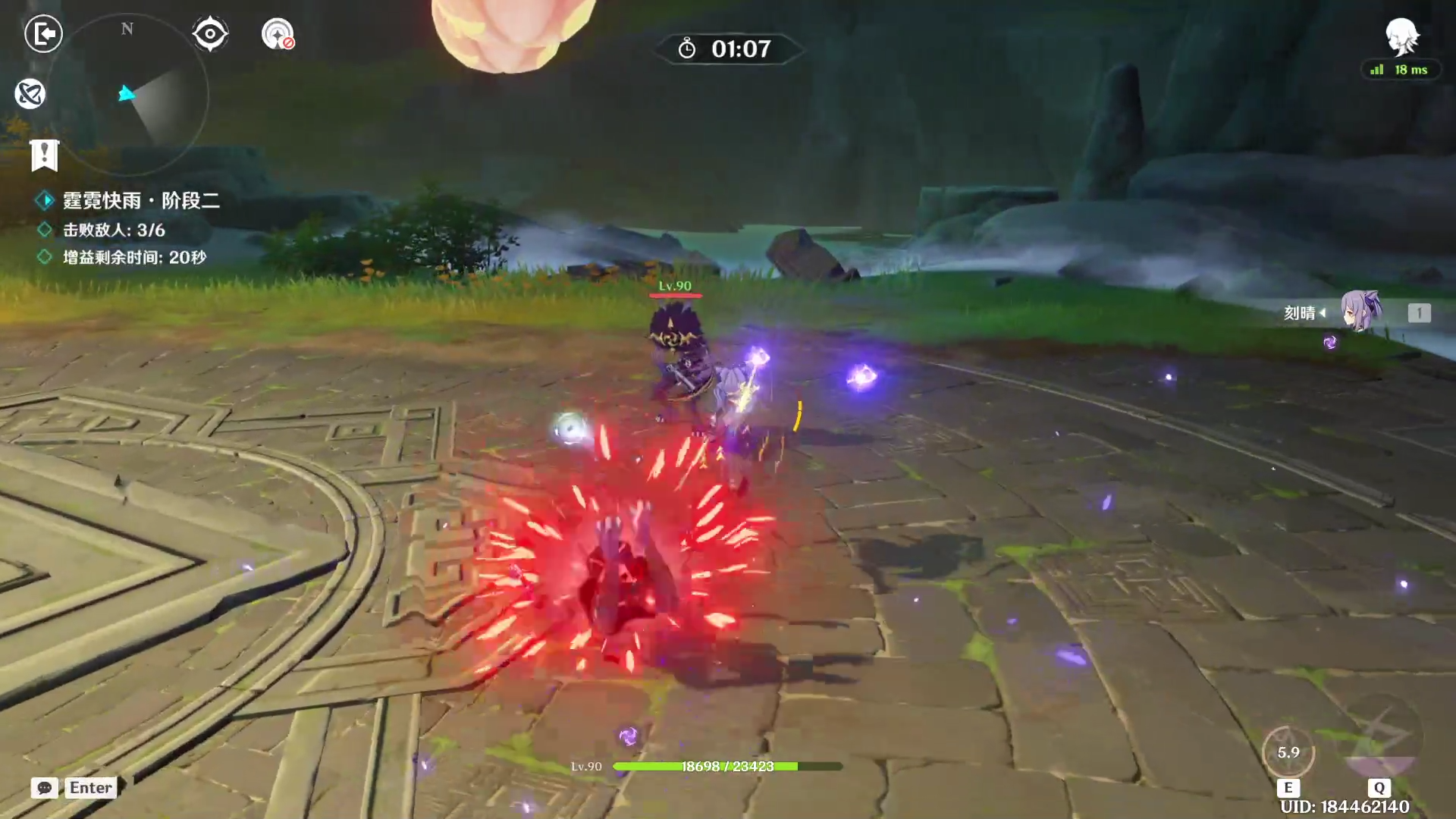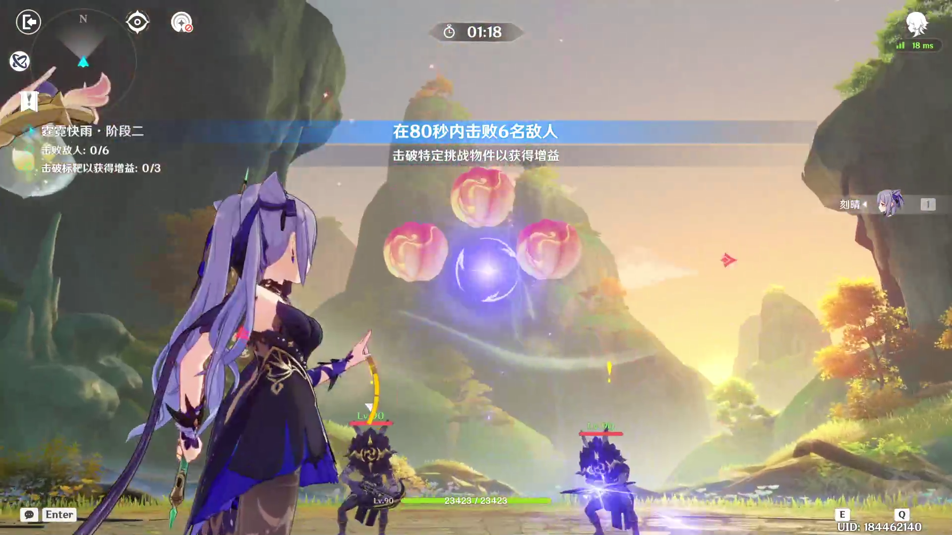 开战后,先往后退一步,调整角度,用雷楔精准击破所有标靶!记住,别用E技能飞天斩击,效率太低!击破标靶后,直接下落攻击,给下面的丘丘人射手来个狠的!