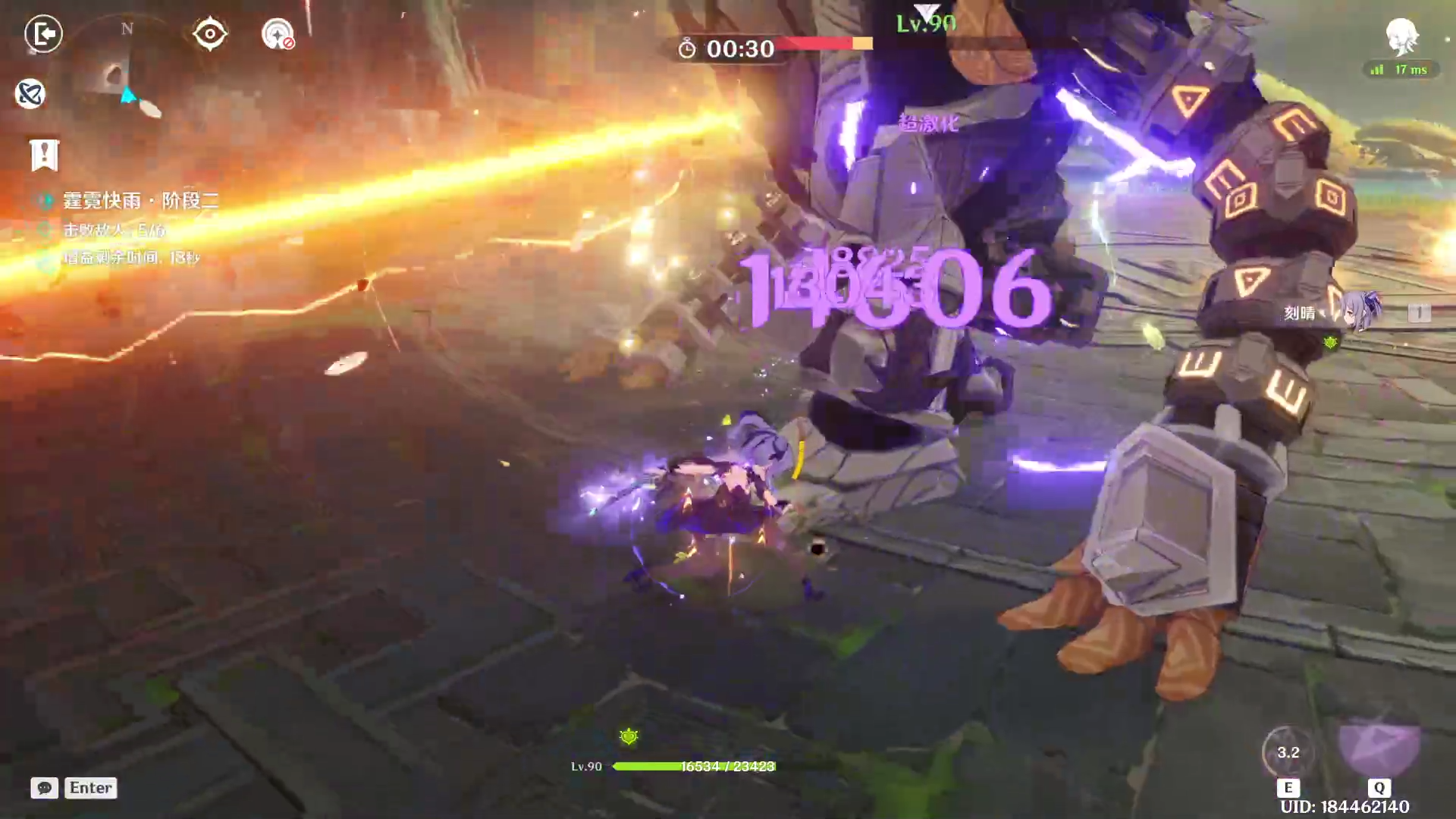 大宝的攻击伤害高,削韧效果强,但攻击前摇也很明显,节奏缓慢。不用怕他反击,刻晴附魔消失的时候,他可能还没出手呢!开战前,先用雷楔击破标靶,获得增益。然后利用刷新的草团附着大宝,放大招!E技能后贴脸位移,持续重击!大宝无法被击退,按住W就能保证重击命中!火力全开,很快就能击败他!