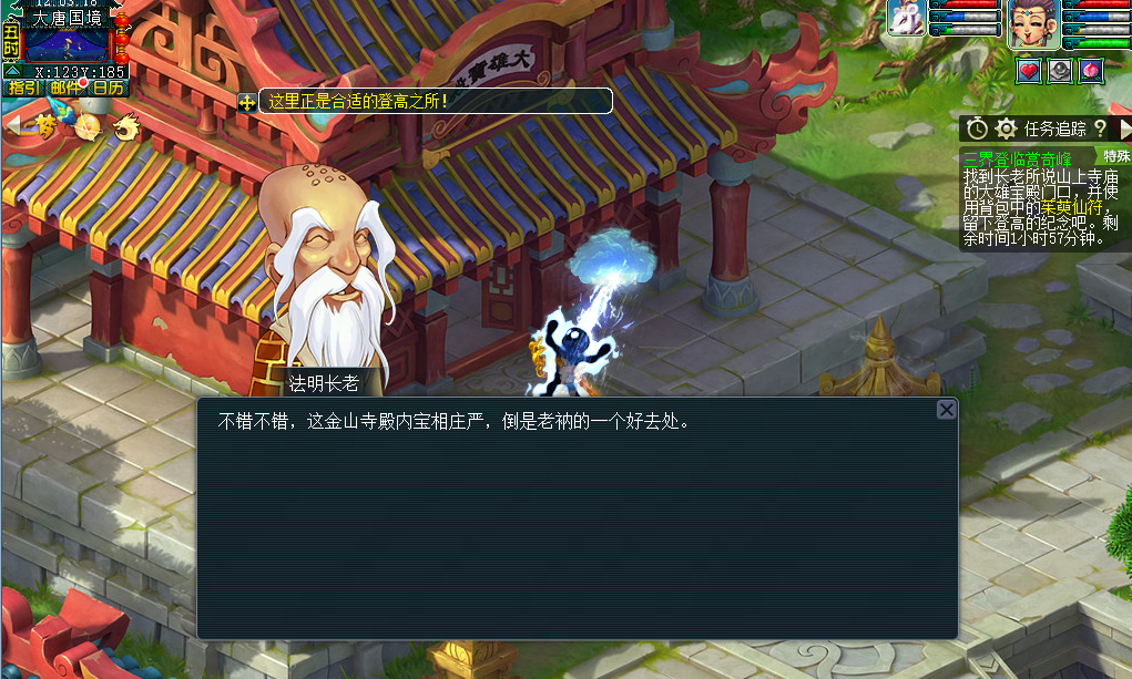 话说这2024年10月11日(算起来是第四天了哈)的登高委托,正确地点就在那风景秀丽、人杰地灵的大唐国境!具体坐标嘛,就在(123,185)附近溜达溜达,抬头看看,是不是雄伟壮丽的大雄宝殿映入眼帘?没错,就是它!