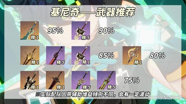 武器选择是个大学问,直接关系到基尼奇的战斗力!经过数据帝们的呕心沥血计算(感谢大佬们!),基尼奇的武器伤害期望值排名如下,请各位老爷们笑纳: