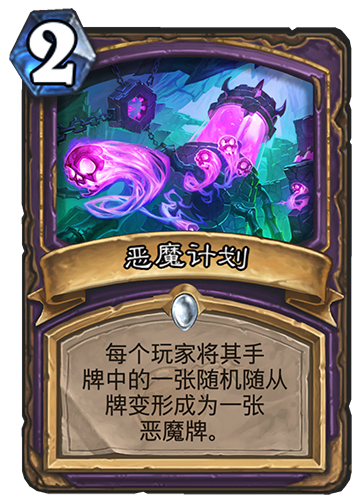 恶魔计划:这张卡能非常有效的克制一些otk套路,等到感觉对手抽到了关键牌之后,我们用恶魔计划可以直接变调他们的一张随从,而如果刚好变掉了他们的关键牌,就能在一定程度上的遏制他们的进攻,甚至可能直接导致他们的败北。
