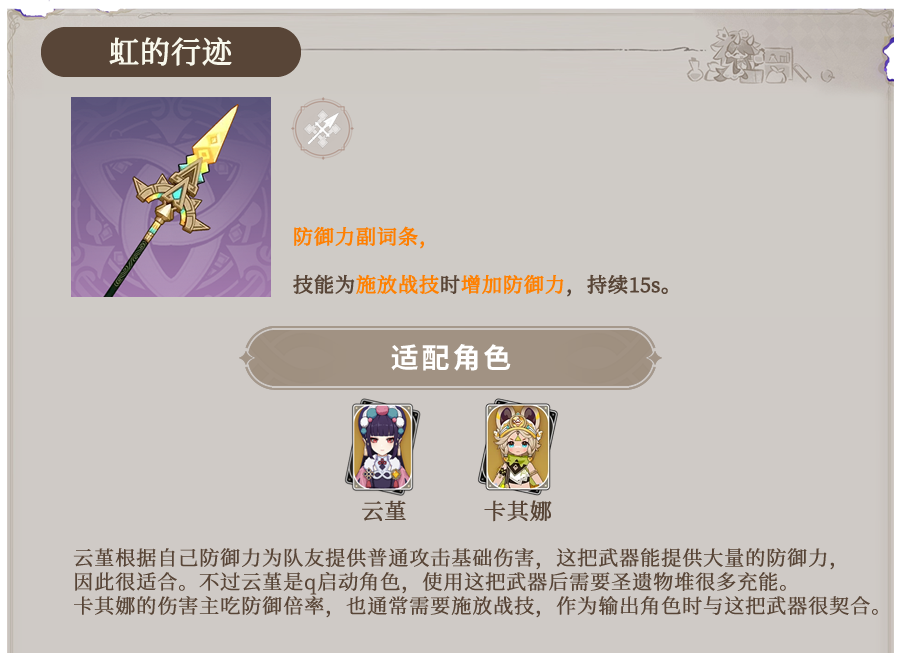 - 【长柄-虹的行迹】:510点基础攻击力,外加高达51.7%的防御力加成!这简直就是防御力爱好者的福音啊!