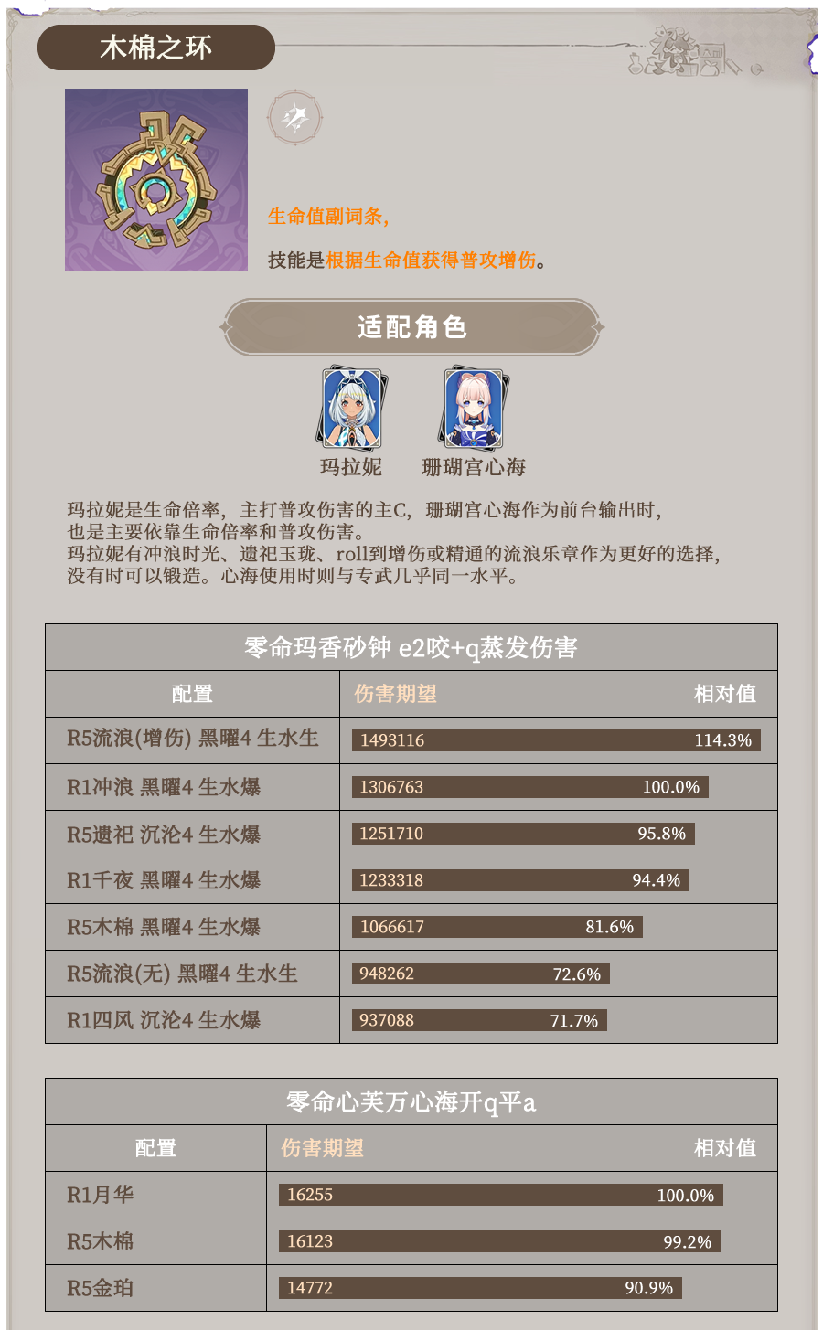 玛拉妮小姐姐可是生命值倍率的主C,靠着优雅的普攻就能打出爆炸伤害。而我们的“珍珠奶茶”(珊瑚宫心海),在前台C位出道时,也是个依靠生命值倍率和普攻输出的狠角色。所以,这俩妹子简直是“木棉之环”的完美CP!