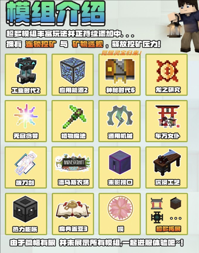 这是一个基于1.12.2版本的群组模组整合包!科技、魔法、养老、暮色、匠魂、植物魔法,各种元素完美融合,再加上丰富到让你眼花缭乱的时装和大量定制内容,保证让你玩到停不下来!