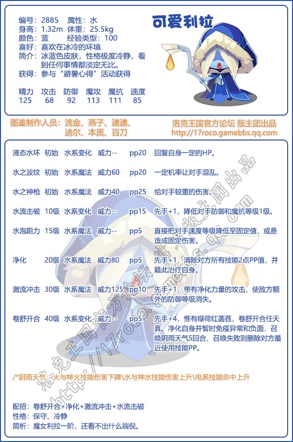 可爱利拉,腾讯游戏《洛克王国》中的宠物原型是《洛克精灵战记》中的同名精灵,可以超进化为魔女利拉。冰蓝色皮肤,性格极度冷静,看到任何事情都淡定无比。