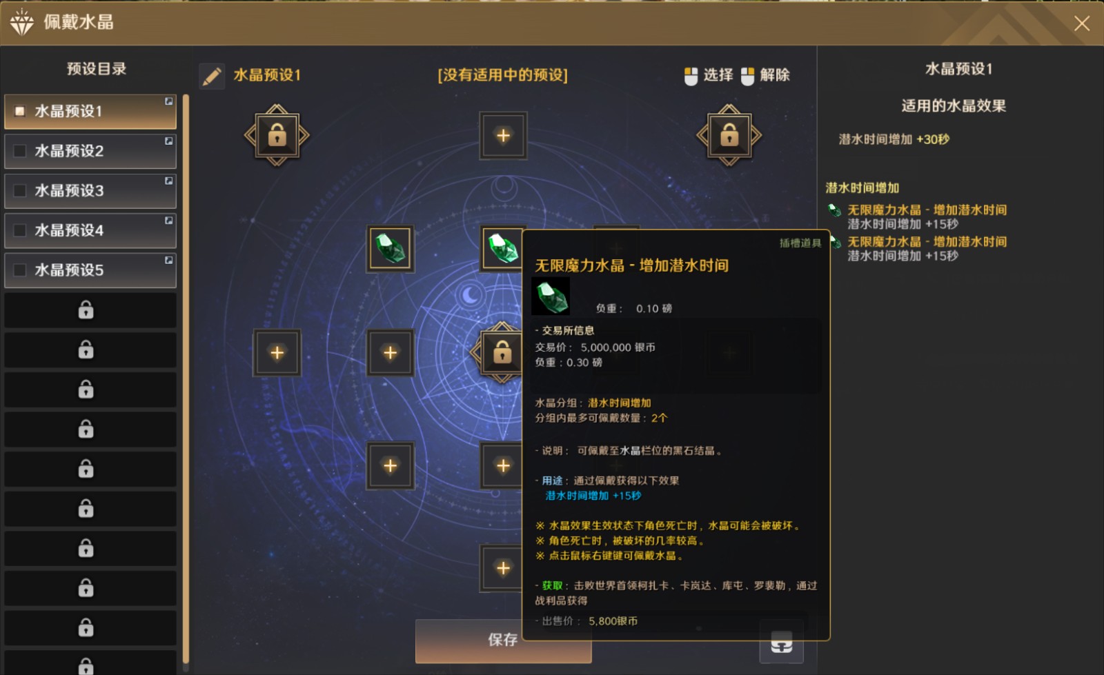 将无限魔力水晶─潜水时间增加装在水晶背包。使用2个水晶就能让潜水时间提升30秒。