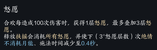 起手月袭,保证月袭buff全程覆盖,后面月袭好了就用,绝情推月相然后打月刃之息,怒愿buff最高三层,需要用扶摇触发,使用扶摇后每一层怒愿buff可以让自己打3个白嫖绝情,最多9个,扶摇之后可以使用风花雪月(高伤害),扶摇之后打完9个白嫖绝情让风花雪月增伤,之后再用风花雪月。