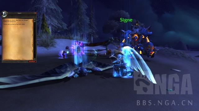 On The Dead of Night, we need to protect the two Val'kyr sent by Sylvanas as they attempt to raise both Delaryn and Sira. However, the Night Warrior herself, Tyrande Whisperwind, arrives! While the ritual happens, Malfurion Stormrage also shows up. Unfortunately, the Val'kyr manage to raise both Delaryn and Sira, who turn against Tyrande. This is not without a complete loss for the Alliance - Brynja, one of Sylvanas' Val'kyr, die in the process.