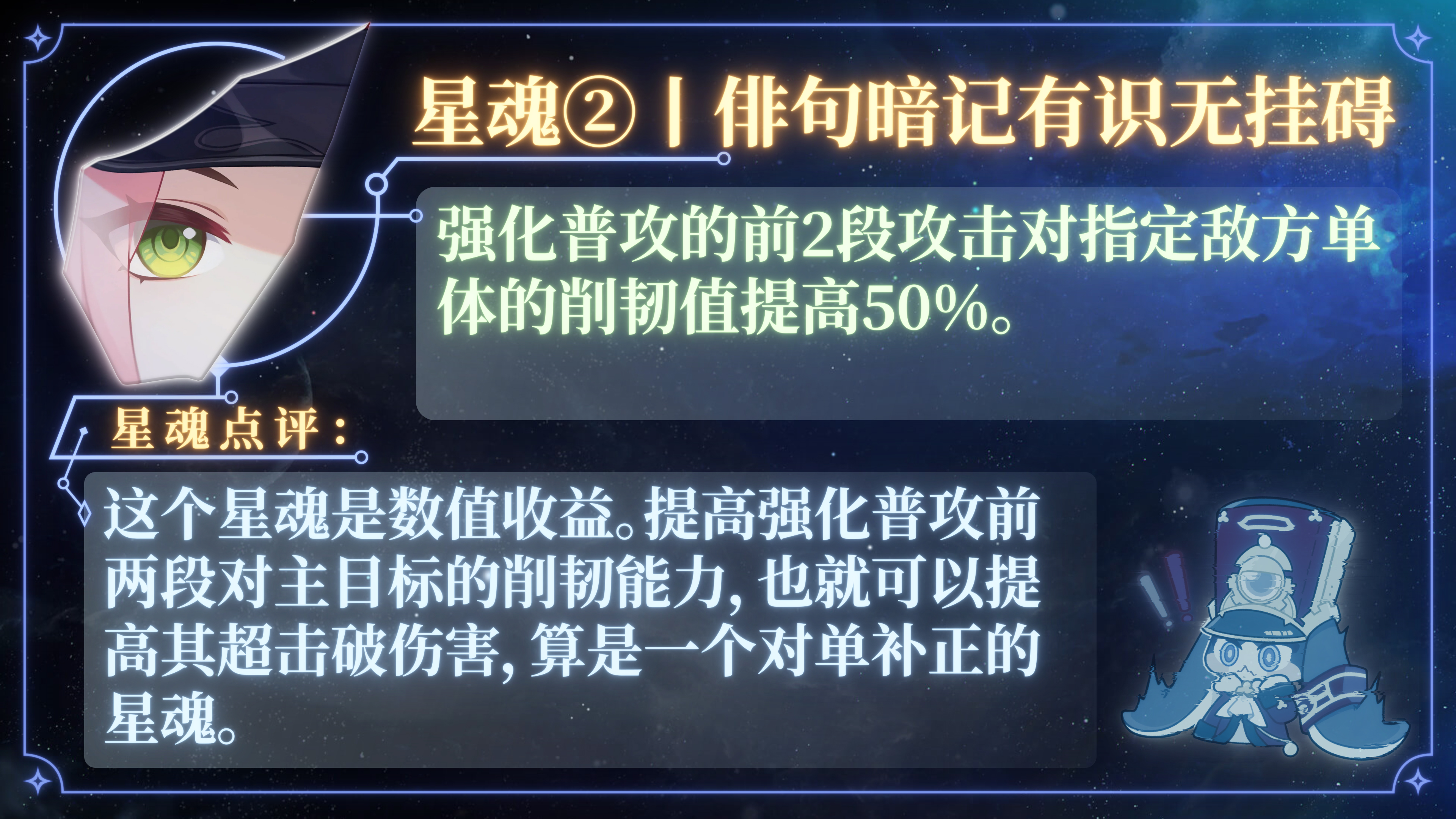 这个星魂是数值收益。提高强化普攻前两段对主目标的削韧能力,也就可以提高其超击破伤害,算是一个对单补正的星魂。
