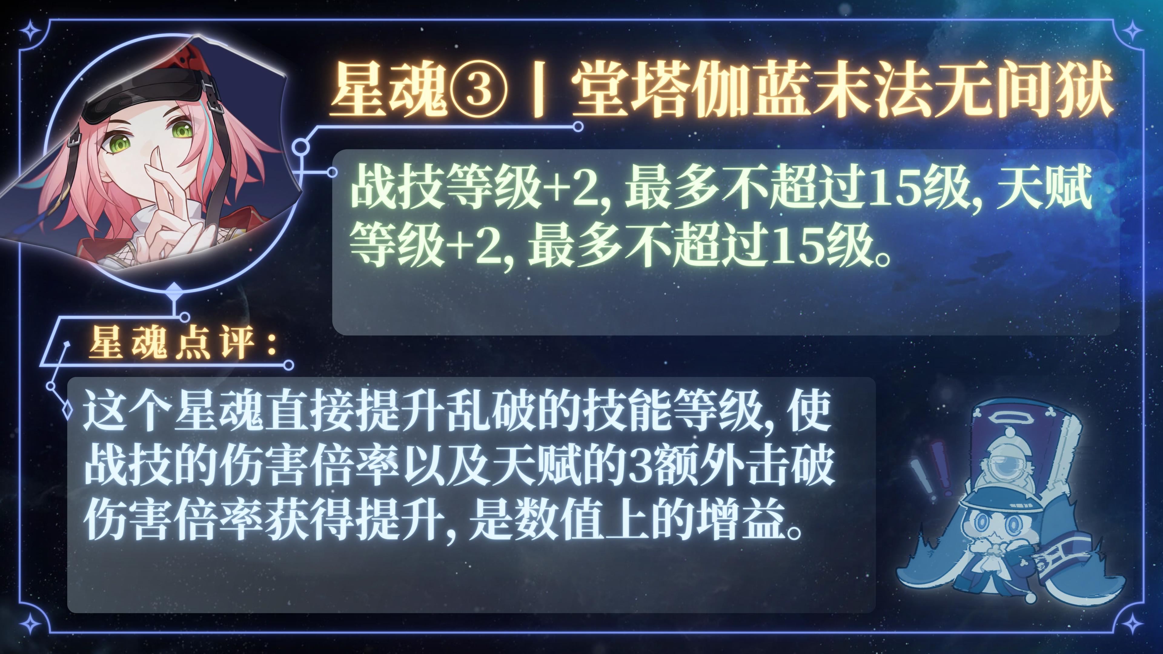 这个星魂是数值收益,覆盖爆发期的无视防御有效提高乱破的击破伤害和直伤伤害。退出爆发期的回能又可以显著提高终结技的覆盖率,大幅度优化循环体验。