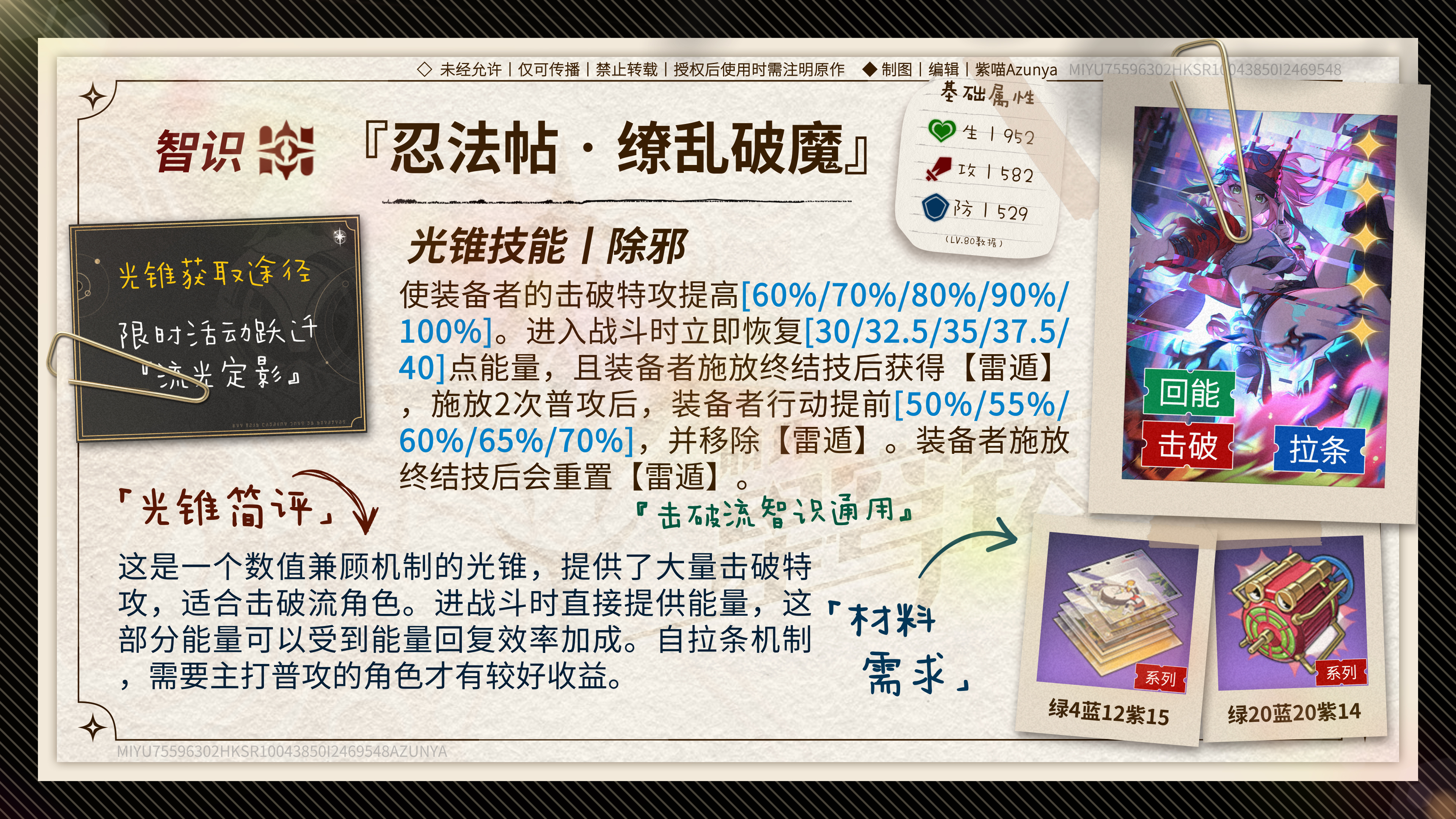 这是目前击破流智识的唯一四星光锥,满叠影时提供接近1叠专武的击破特攻,此外还有施放终结技后加速的效果,持续时间2回合是可以覆盖乱破的爆发期的,一定程度上能加快爆发期的出伤速度,抢在敌人恢复韧性之前把爆发打完。