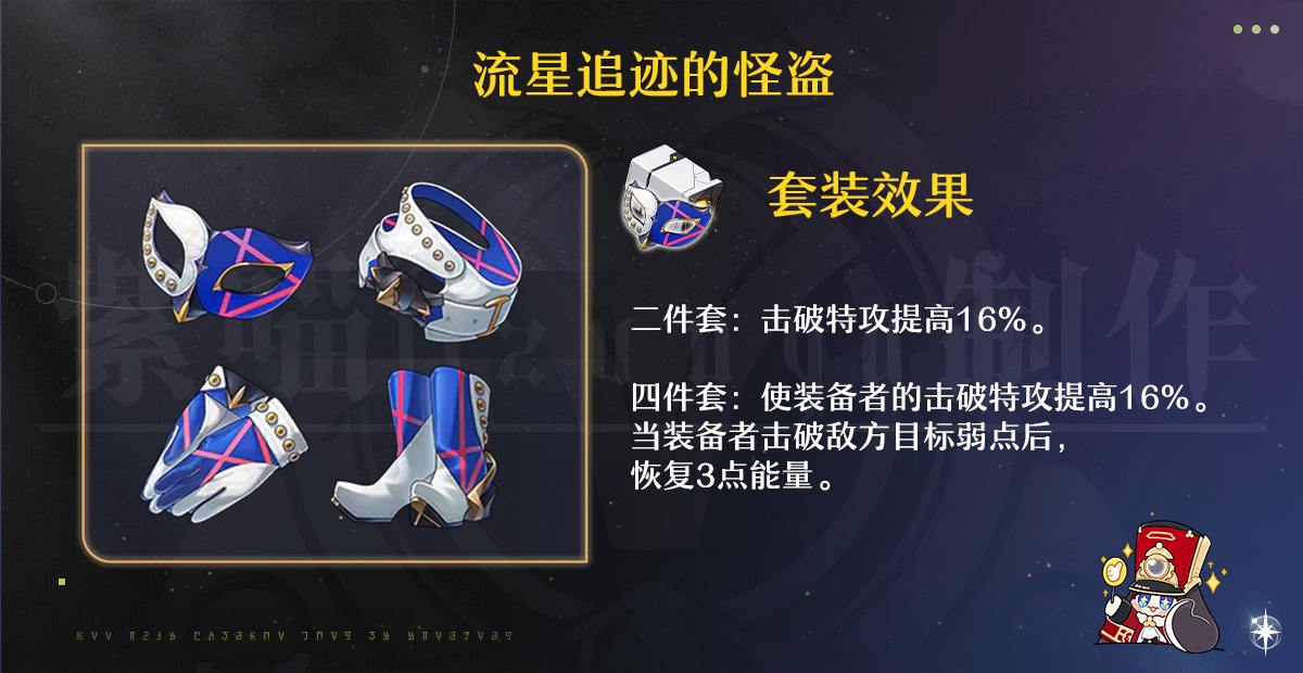 解析:这个套装提供击破特攻和一点点击破后额外能量。乱破也是可以使用的,如果懒得刷铁骑套,那么这个套装也能用。