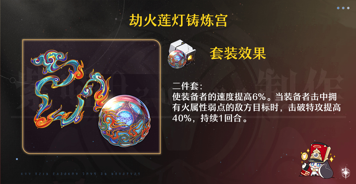 解析:这个套装常态提高速度,当击中火弱点敌人时额外提高击破特攻。一般在面对火弱点敌人时才会使用。