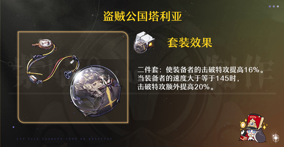 解析:这个套装常态提高击破特攻,当进战后速度达到145时可以额外再获得击破特攻。是乱破比较通用的套装,只要速度达标就都可以使用。