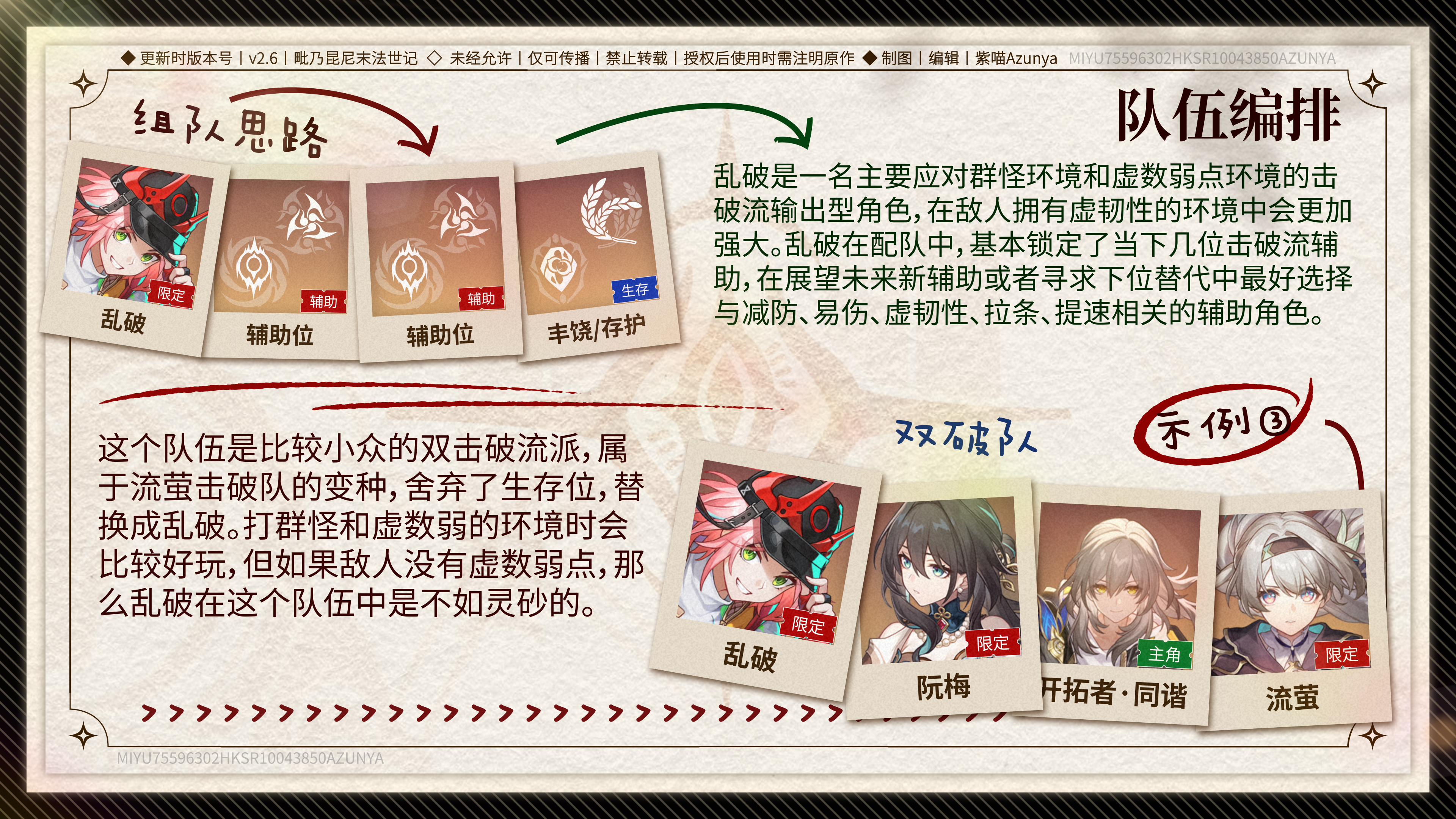这个队伍是比较小众的双击破流派,属于流萤击破队的变种,舍弃了生存位,替换成乱破。打群怪和虚数弱的环境时会比较好玩,但如果敌人没有虚数弱点,那么乱破在这个队伍中是不如灵砂的。