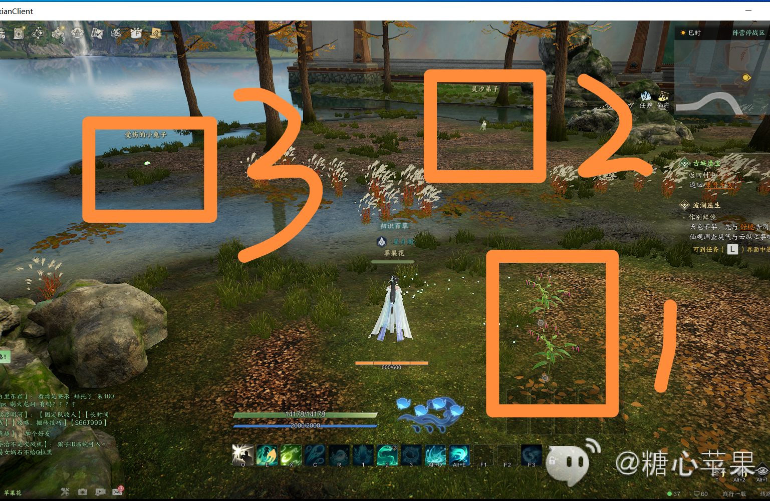 第一步采集上善灵草,然后交给序号二的灵汐阁弟子,提交后在辅助技能栏里会出现一个“次级锦鲤鳐”的技能,存在时间10秒,尽快选中序号三的兔子,释放技能动作快可以一次奶满血,如果一次不能奶满,那就再重复以上顺序来一次