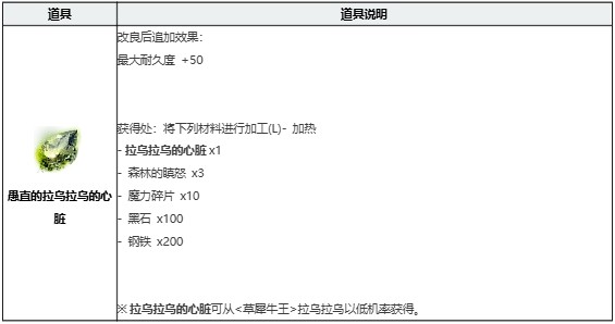 可以透过使用「愚直的拉乌拉乌的心脏」道具来改良[狩猎]名匠火绳枪,从而将最大耐久度增加50。