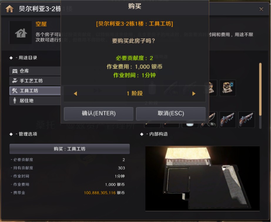 左键点击箭头标示的家,就会显示用途变更画面,选择工具工坊点击购买。