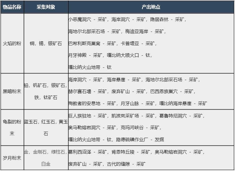 下列的粉末在采集等级达到熟练LV5以上时,采矿时能以低机率获得各种矿石。
