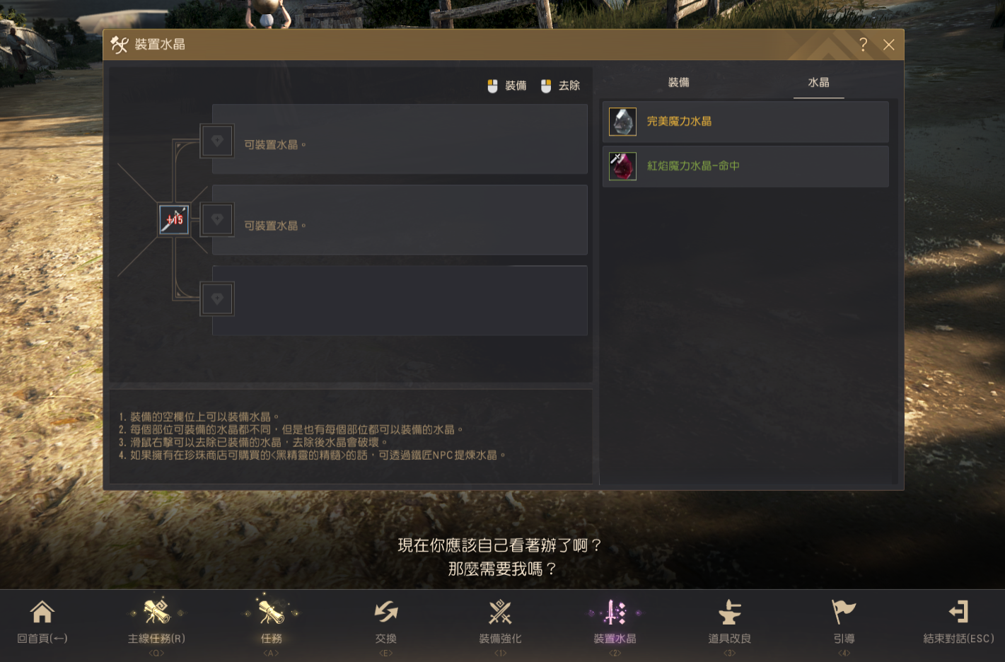 如果使用的装备上有可以装置水晶的栏位,赶快通过黑精灵(快捷键:/)选项中装置水晶的功能变得更强吧!