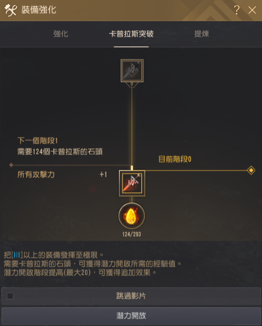 卡普拉斯突破分为20阶段,每个阶段消耗数目不等的卡普拉斯石,提供该阶段所需要的卡普拉斯石头数量后,就会往上成长一阶,同时装备的能力值也会提高!