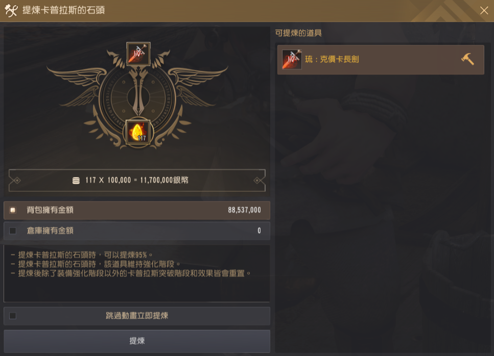 可提炼出原本消耗个数的95%,但每次提炼出1个卡普拉斯的石头会消耗100,000银币!