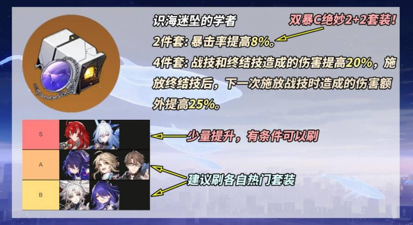 2件套8%暴击率。除了击破、DOT这2个流派,其余吃双暴的主C都能使用‘学者套将成为未来直伤输出角色2+2热门之选’。