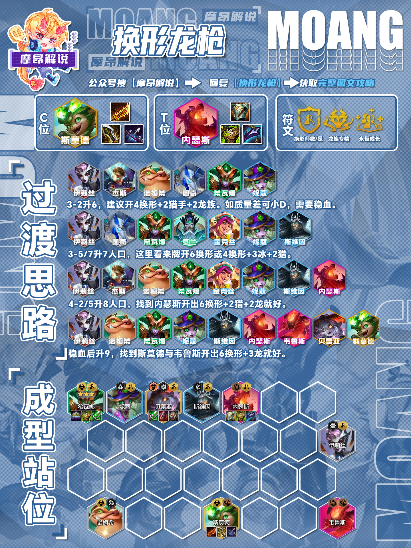 换形龙枪,这个依旧是更新后测试中热度较高的阵容(金铲铲中热度会更高)。这套阵容相对来说在前中期比较强势过渡相对比较容易,而大后期贝蕾亚2星后上限极高,对局中前二率较高,但确定就是中期与中后期强度不高,另一方面贝蕾亚如果不能2星,经常会出现后4名出局的情况。