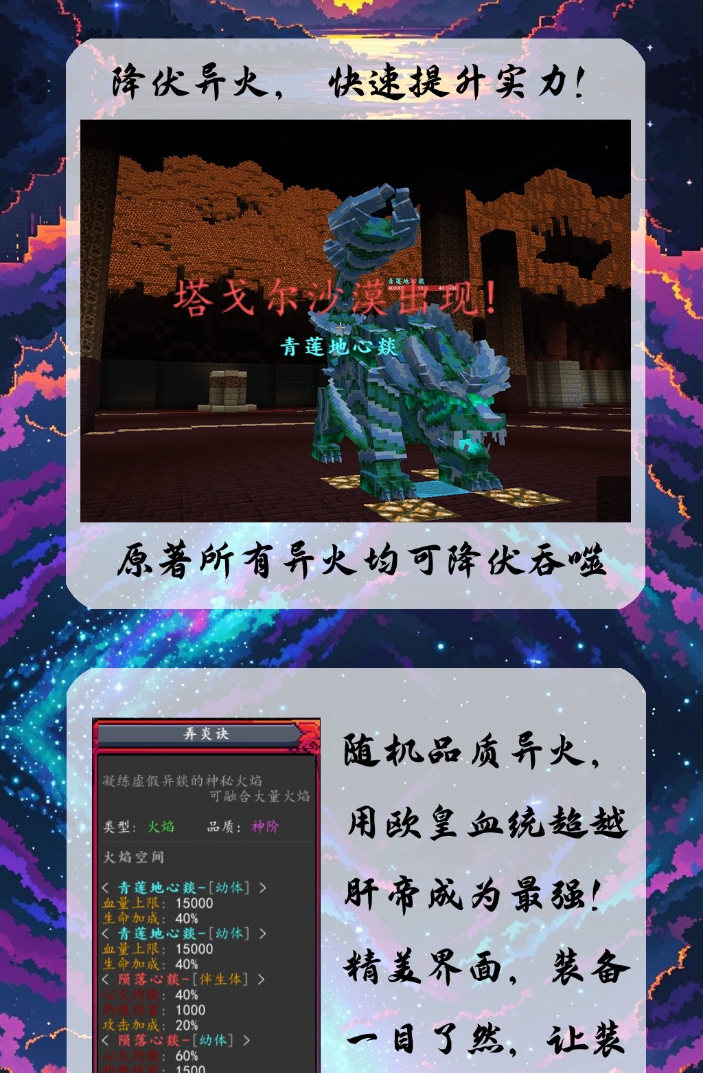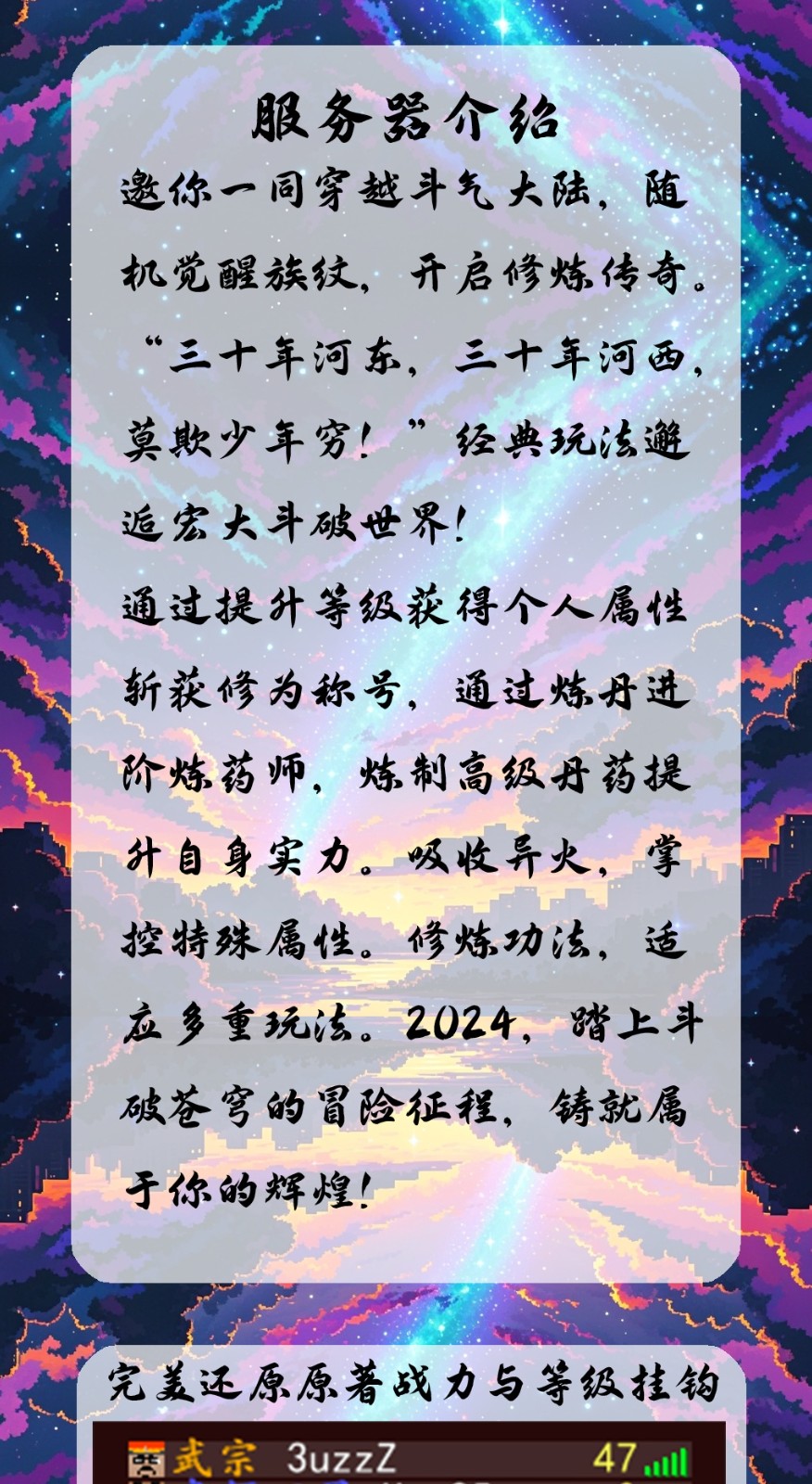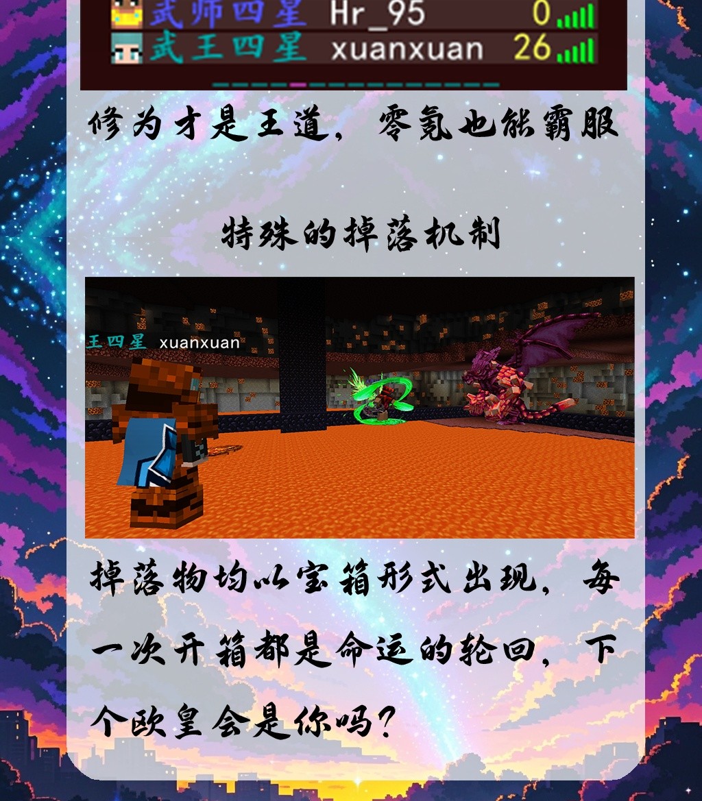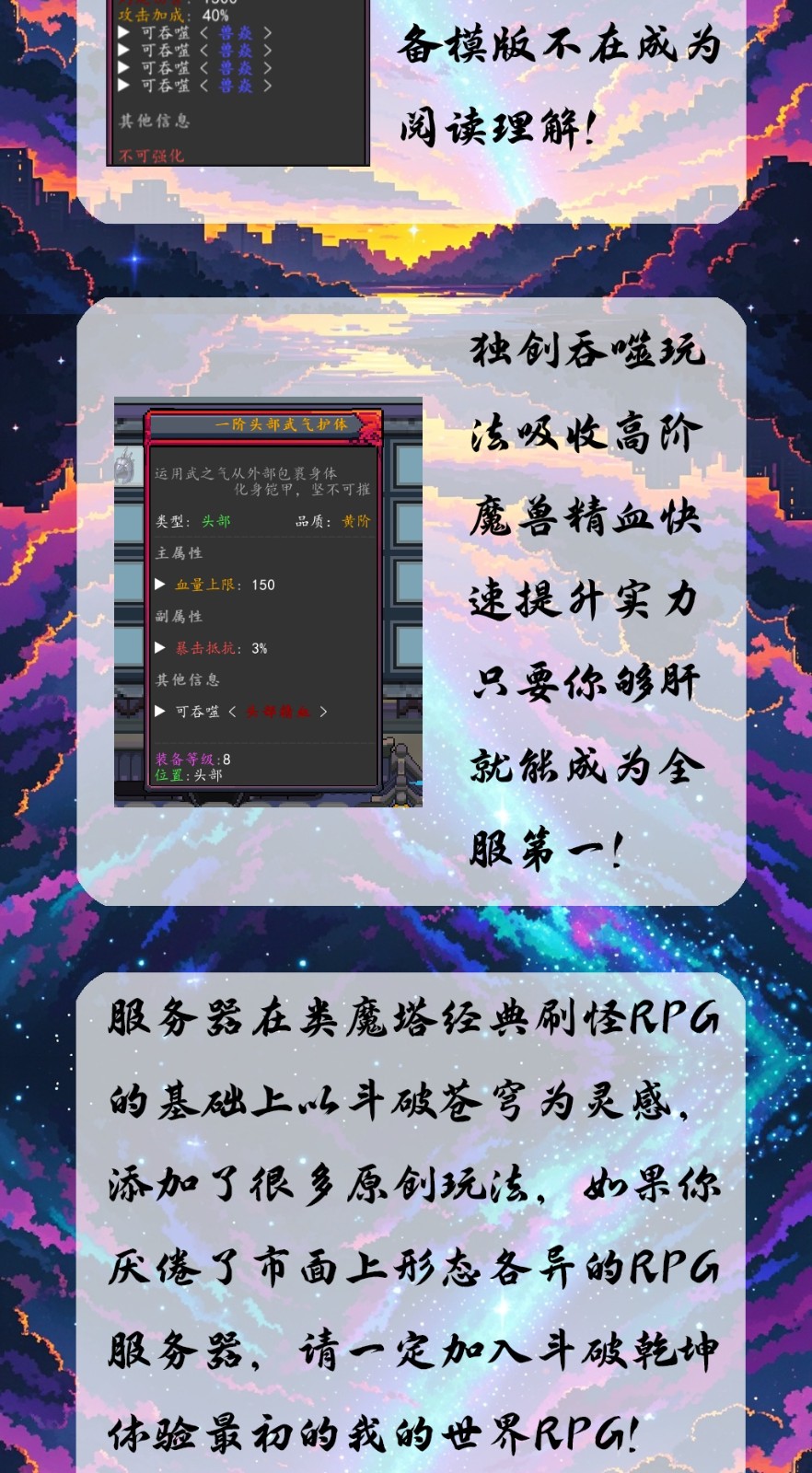 服务器在类魔塔经典刷子RPG的基础上以斗破苍穹为灵感,添加了很多原创玩法,如果你厌倦了市面上形态各异的RPG,请一定加入斗破乾坤体验最初的我的世界RPG!
