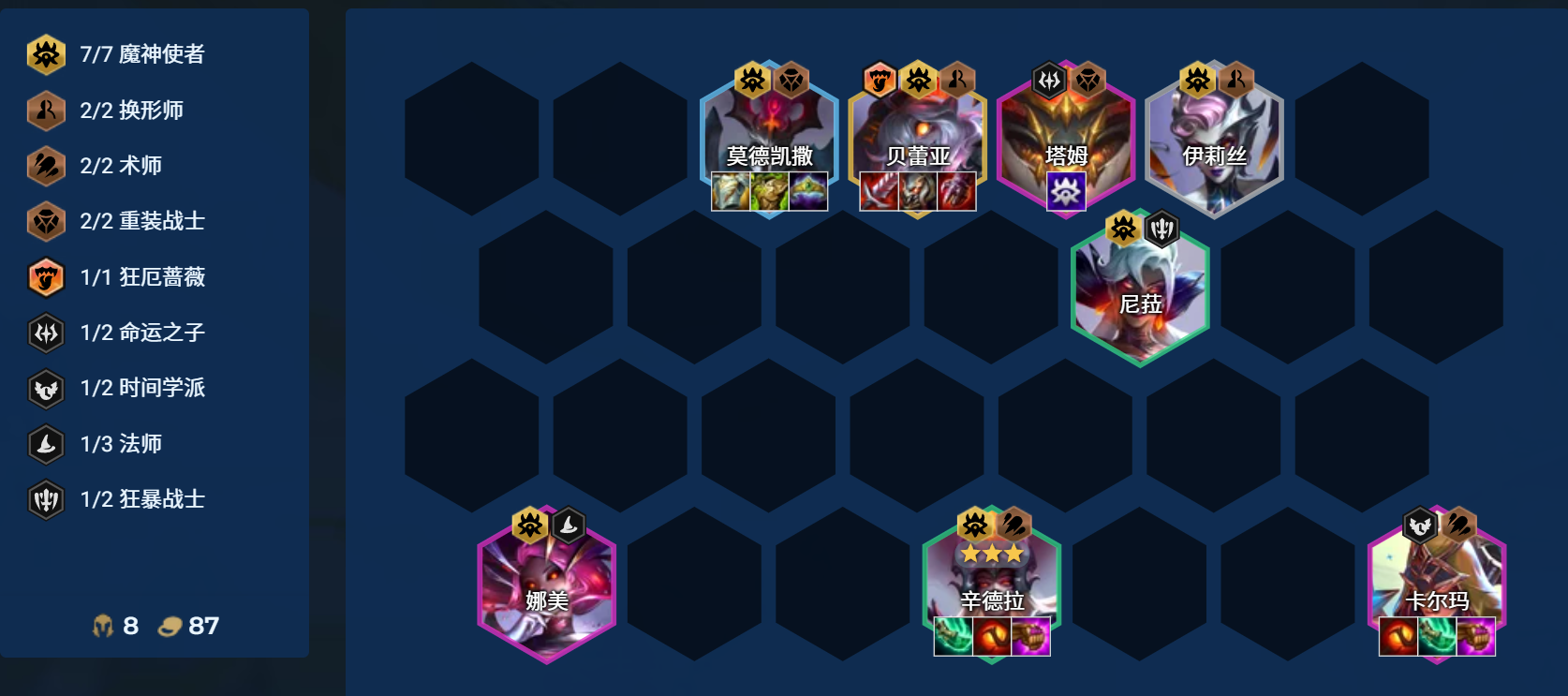 但摩昂还是建议由魔神转或吉祥物在冲,这样过渡会更稳定,特别是金铲铲中玩换形的太多,这个贝蕾亚真的不好搜。