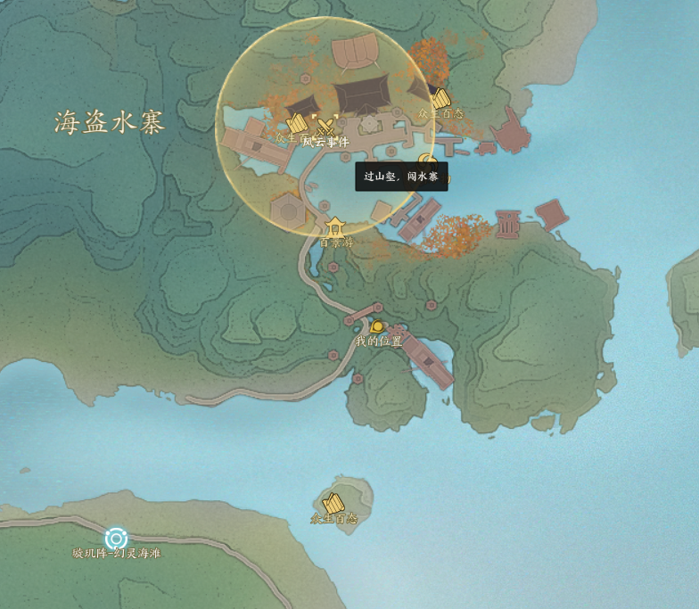 过山壑,闯水寨 该事件为塞外聚,烽火燃后续,原地等待事件刷新,打开地图查看位置 击败怪物
