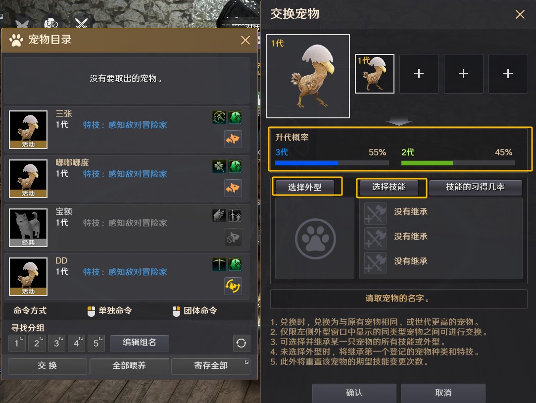 在要交换的宠物中,可透过选择外型和选择技能按钮,挑选冒险家想要继承的外型和技能。