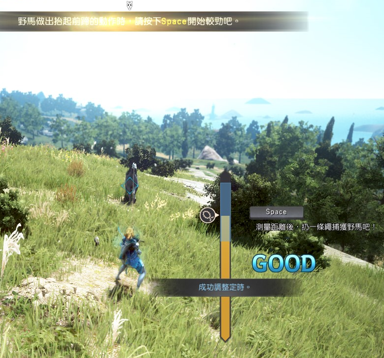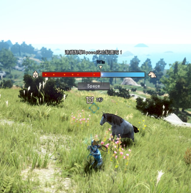 接下来请在读条跑到蓝色区域时按下空格键,成功后就会进入到驯养野马的阶段。