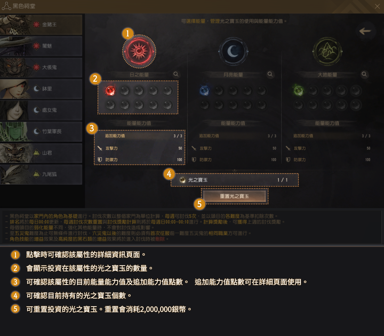 冒险家可以确认各头目具有的太阳/月亮/大地属性的弱点,并在该属性投资,将战斗引导至有利的方向。
