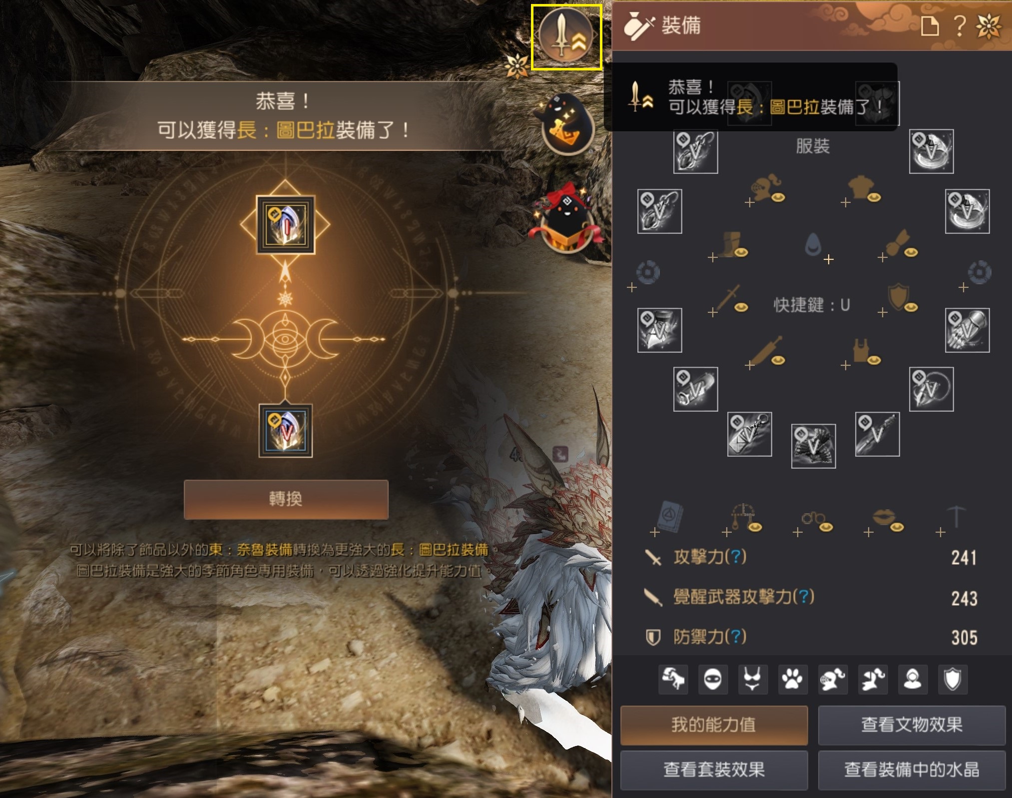 如果是季节角色可以透过装备视窗的交换选单将东(V)奈鲁装备交换成长(I)图巴拉装备。(饰品除外)