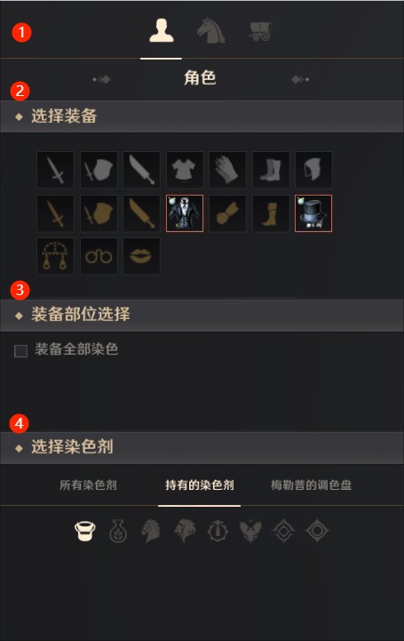 ① : 可以选择染色对象。(角色/马&驴子/马车/骆驼/野营地)坐骑或是野营地的情况,必须要是已被召唤的状态。