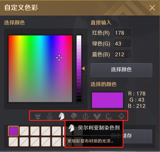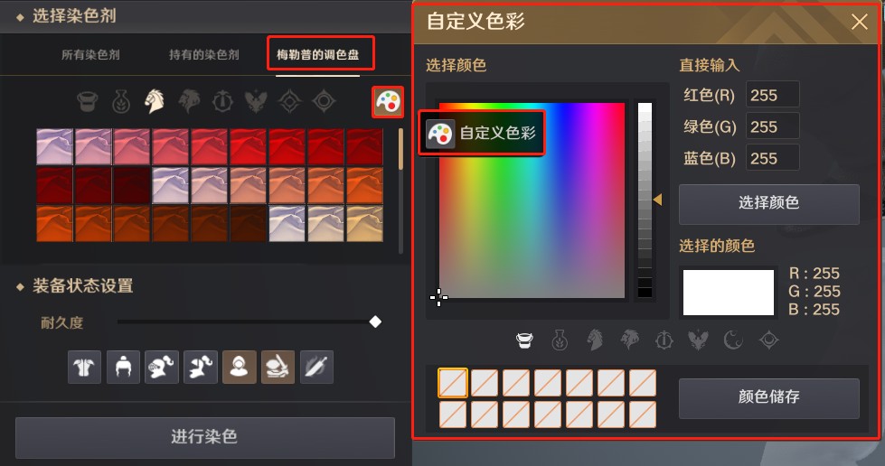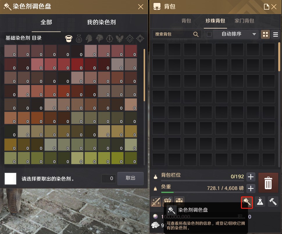 如果在背包中用鼠标右键点击染料,染料会登录至调色盘,登录的染料可以在调色盘或是染色选单中确认。