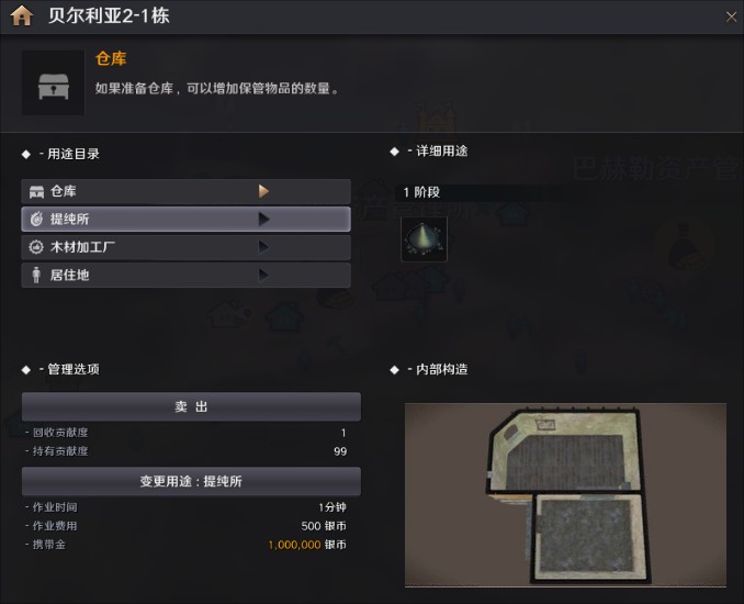 房子的用途大致上分为居住地、宿舍提纯所、工坊、改良所、加工厂、制作厂、马牧场等。