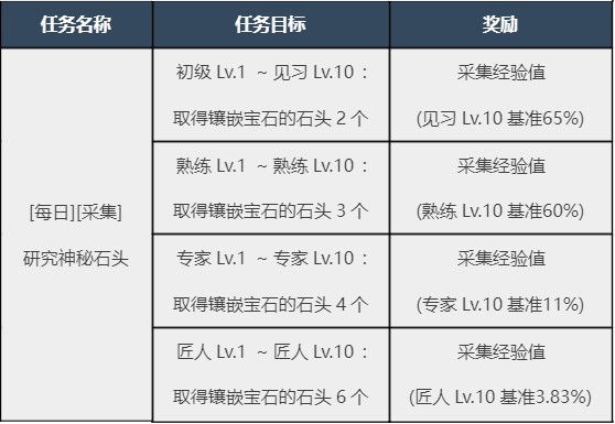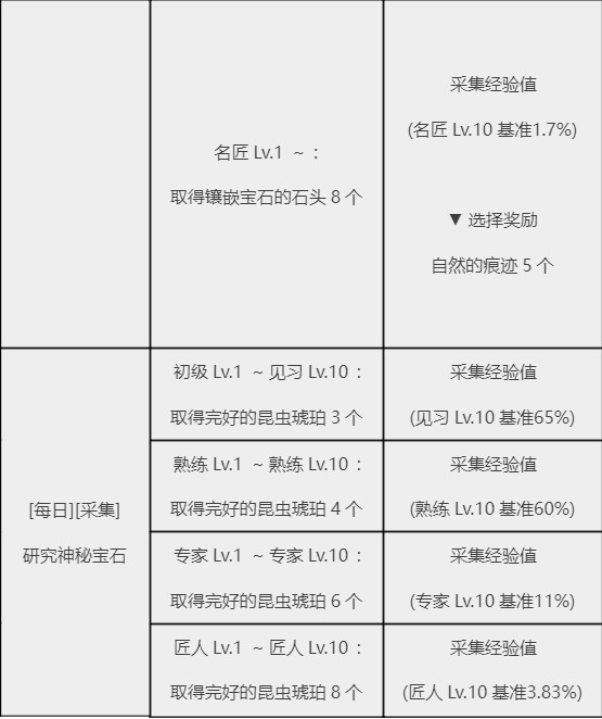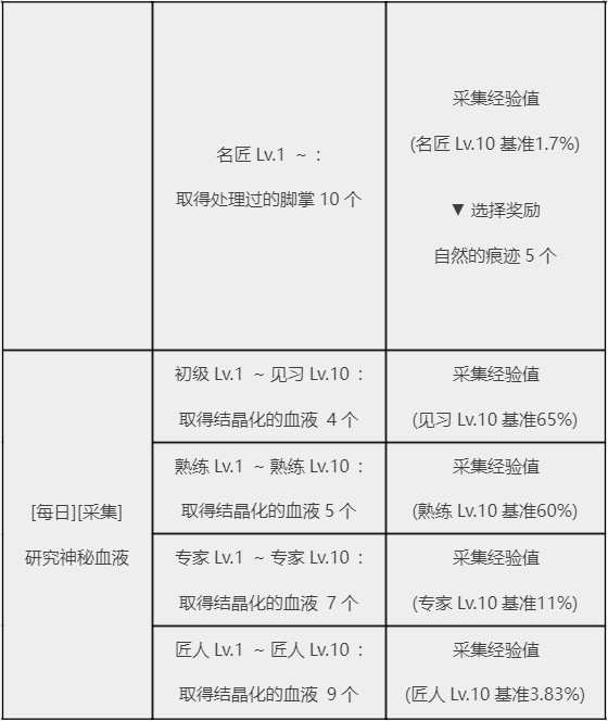 每日任务和每周任务中可以获得采集经验值和「弗洛亚摩斯花瓣」,且「弗洛亚摩斯花瓣」可透过简易炼金制作1小时内生活熟练度100和生活经验值获得量增加20%的「弗洛林秘籍」。