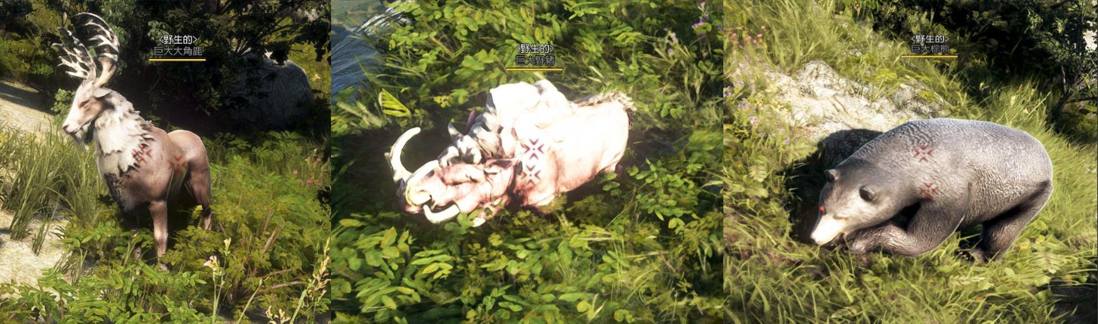这些狩猎怪物巨大大角鹿、巨大野猪、巨大棕熊名称上方都挂着 <野生的> 称号,可以轻易的与一般怪物做区分。