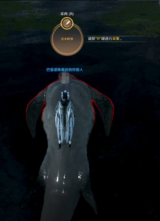 完成狩猎后,淡水鳄鱼的尸体会浮出水面,这时可利用屠宰用刀进行屠宰,即可获得狩猎经验值与肉等物品。