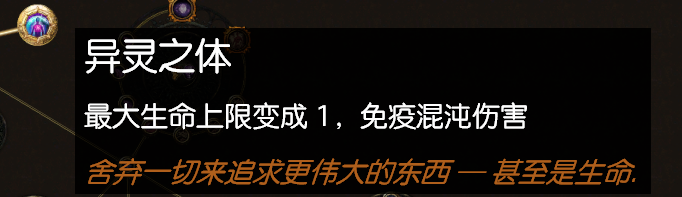 因为矿洞之中的黑暗持续伤害是按照你的最大生命+最大护盾的百分比来扣血的,所以点出异灵之体让最大生命变为1,这里说下黑暗造成的伤害不是混沌伤害,所以后面那个免疫混沌伤是没用的。