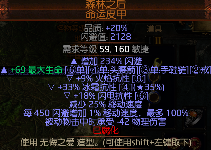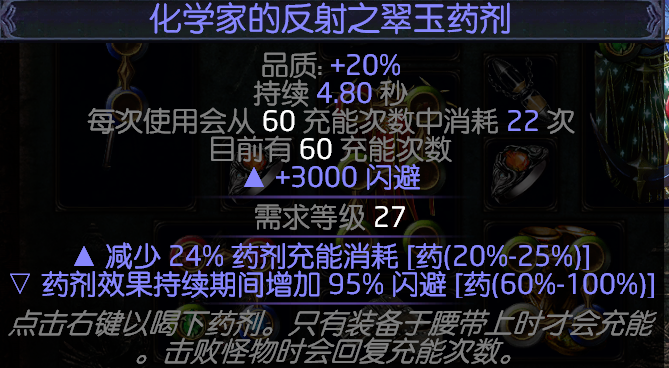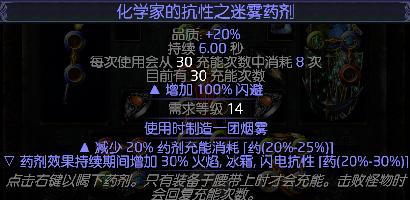 迷雾药剂可以增加100%的躲避值,造成的迷雾给以给怪物致盲,不过和致盲仗的属性重复了,属性要求减少药剂消耗,后缀随意。