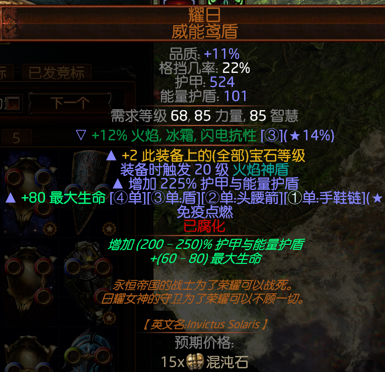 选这个盾的原因是装备是触发20级元素神盾,相当于给你增加了1000的元素护盾,受到元素伤害优先扣除元素护盾,而不是你本身的护盾值,元素护盾在不受到伤害的前提下每10秒钟自动回复到最大值盾牌千万不要上品质!!
