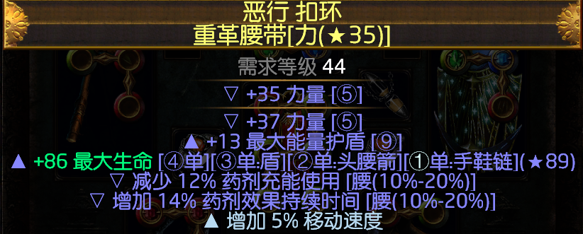 然后接下最后一件腰带,选择重革黄色稀有腰带,因为我们带的元素神盾力量的需求高达159点,所以推荐使用重革腰带来增加力量,尽量不要有增加能量护盾的词缀,(因为你的护盾值越高,在黑暗中待的时间越短。)我们需要的只是减少药剂充能,和药剂持续时间,可以让我们的续航能力更持久。重革没有合适的话其他腰带也一样,实在不行天赋点下力量大点就可以。